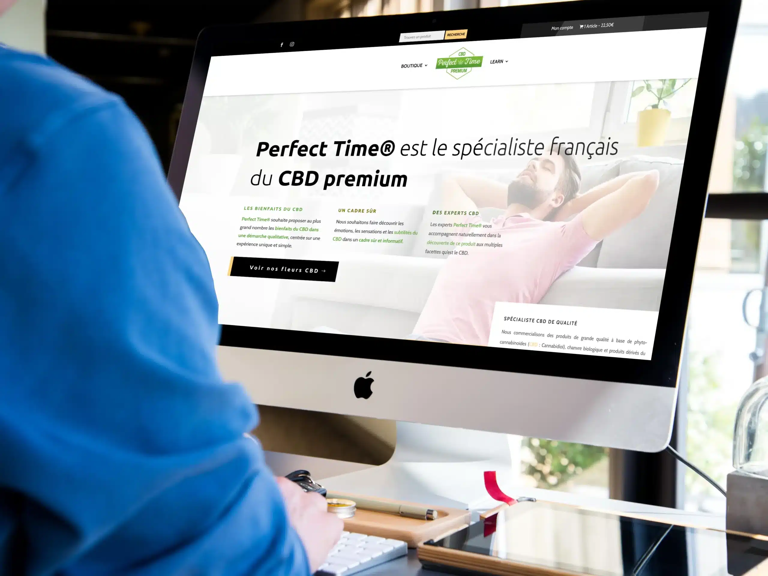 Conception d’un site e-commerce pour un client de Paris, pour de la vente en ligne avec Perfect Time CBD : design, mise en page, utilisation du theme builder Divi pour la structure des produits et catégories, optimisations SEO.